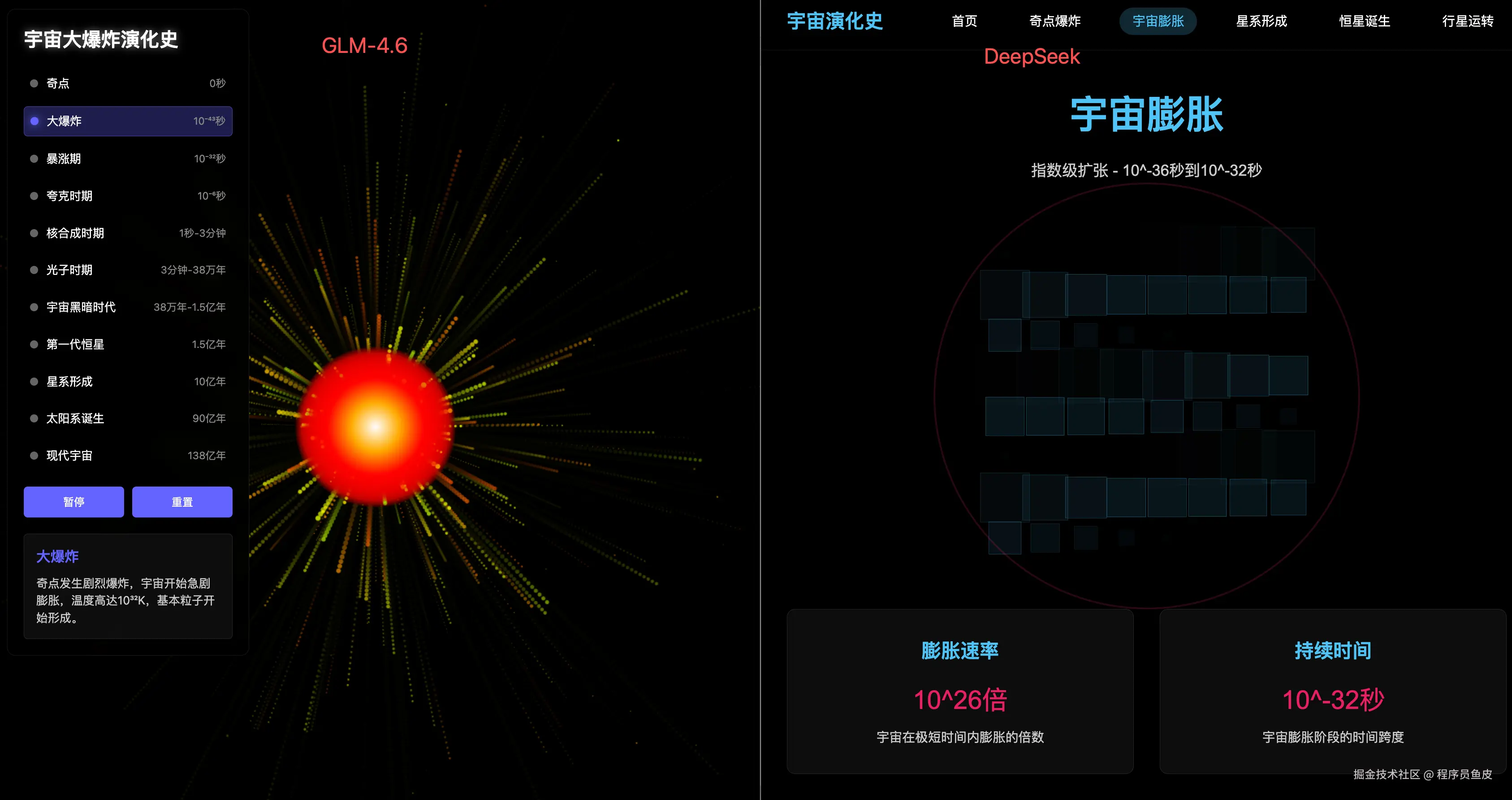 2)然后是一个宇宙大爆炸 3D 动画演示,这里显然 GLM-4.6 更专注于 “做动画效果”,而 DeepSeek 做的更像是一个知识科普网站。
