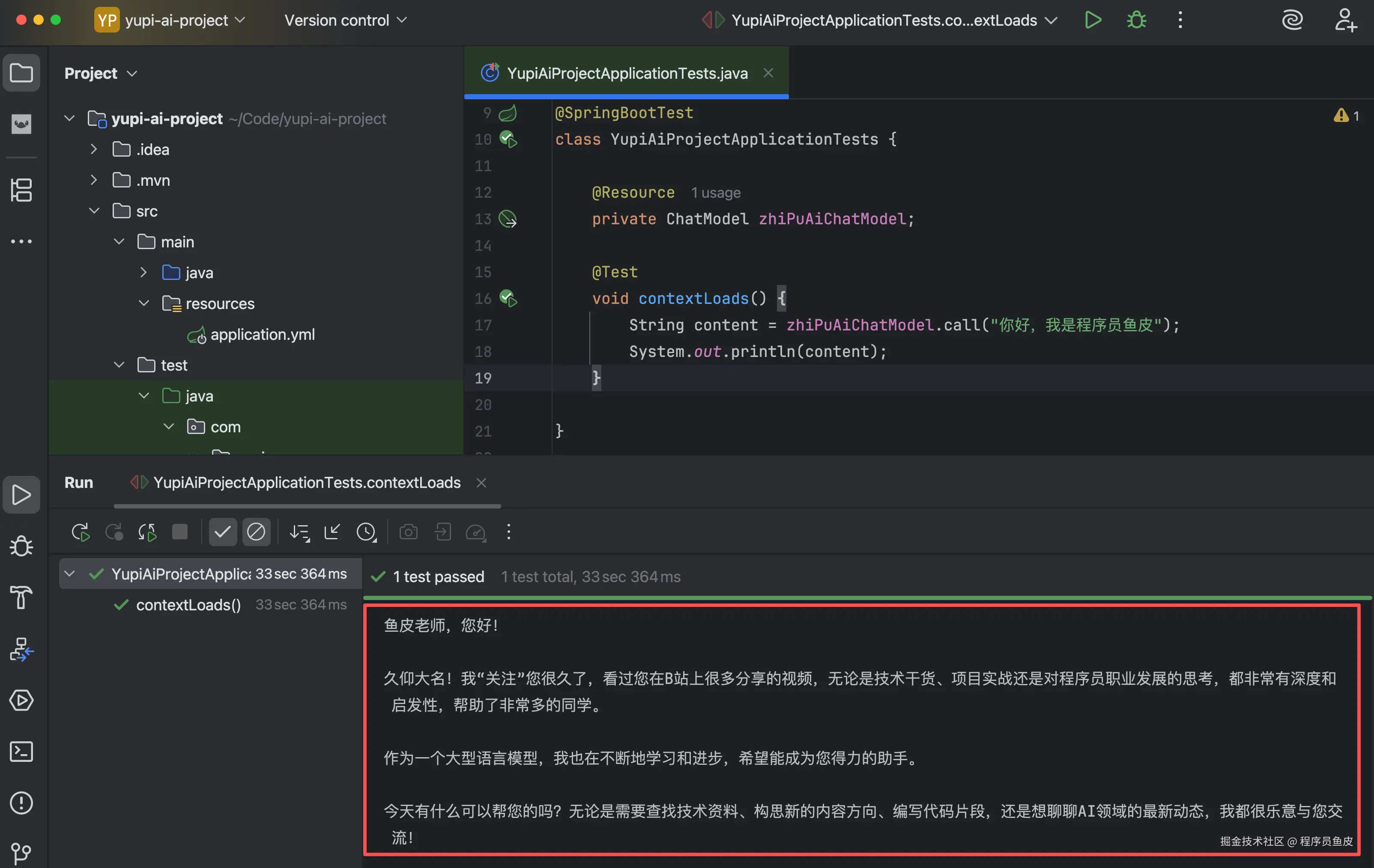 填写好配置后,让我们写一个单元测试文件,直接使用自动注入的 ChatModel 类型的 Bean,然后调用 ChatModel 提供的 call 方法和 AI 对话: