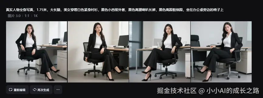进入即梦AI首页,选择"文生图",输入提示词"真实人物全身写真,1.75米,大长腿,美女穿着白色紧身衬衫,黑色小西装外套,黑色高腰喇叭长裤,黑色高跟鞋细跟,坐在办公桌旁边的椅子上",点击生成