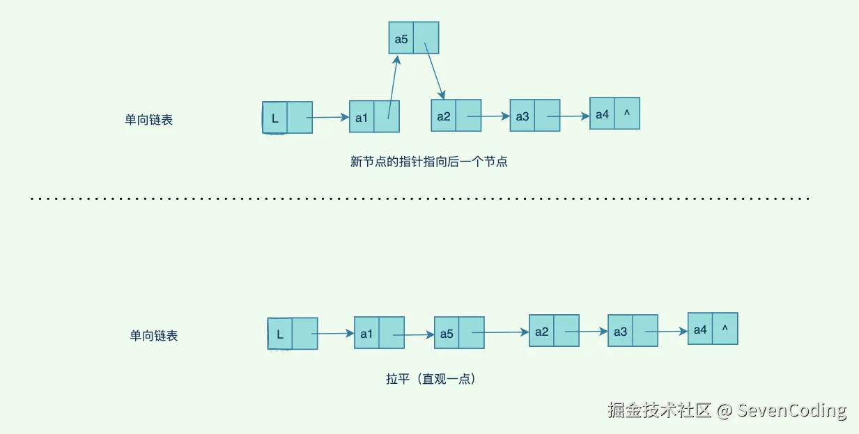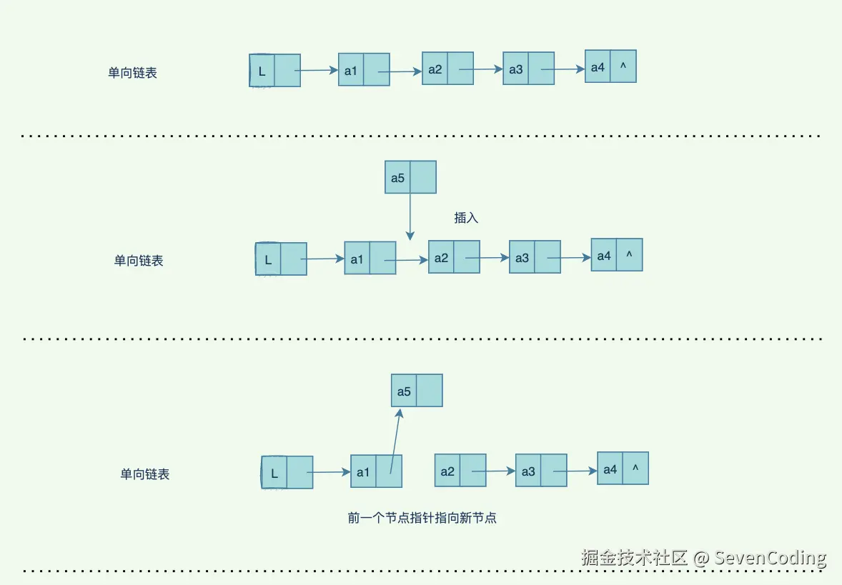 单向链表的查找更新⽐较简单,我们看看插⼊新节点的具体过程(这⾥只展示中间位置的插⼊,头尾插⼊⽐较简单):
