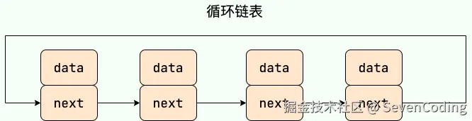 循环链表 其实是一种特殊的单链表,和单链表不同的是循环链表的尾结点不是指向 null,而是指向链表的头结点。
