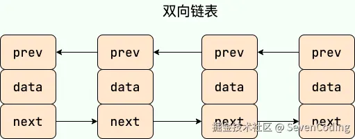 双向链表 包含两个指针,一个 prev 指向前一个节点,一个 next 指向后一个节点。