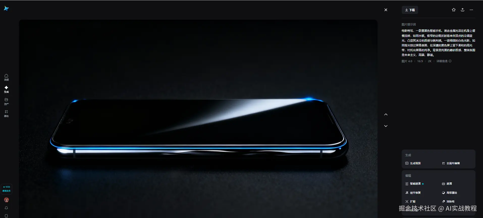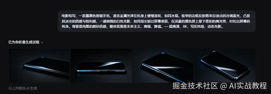 我打开即梦AI,上传了产品的白底图,随后在提示词框里敲下了具体的指令:“电影特写,一款墨黑色智能手机,液态金属光泽在机身上缓慢流转,如同水银。极窄的边框反射着来自顶点的冷调蓝光,凸显其冰冷的质感与锐利感。一道细微的白色光影,如同指尖掠过屏幕表面,在深邃的黑色屏上留下柔和的高光带,衬托出屏幕的纯净。背景是纯黑的磨砂质感,整体氛围是未来主义、高端、静谧。— 超高清,8K,写实风格,动态光影。”