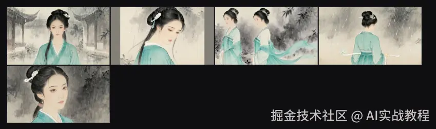 上周拍"女主雨中转身"这场关键戏,我先让即梦AI生成了5张连续分镜图:图1正面站立、图2侧身45度、图3侧身90度、图4背面、图5转回正面。每张图都严格保持:柳叶眉、丹凤眼、白玉簪、青色罗裙。