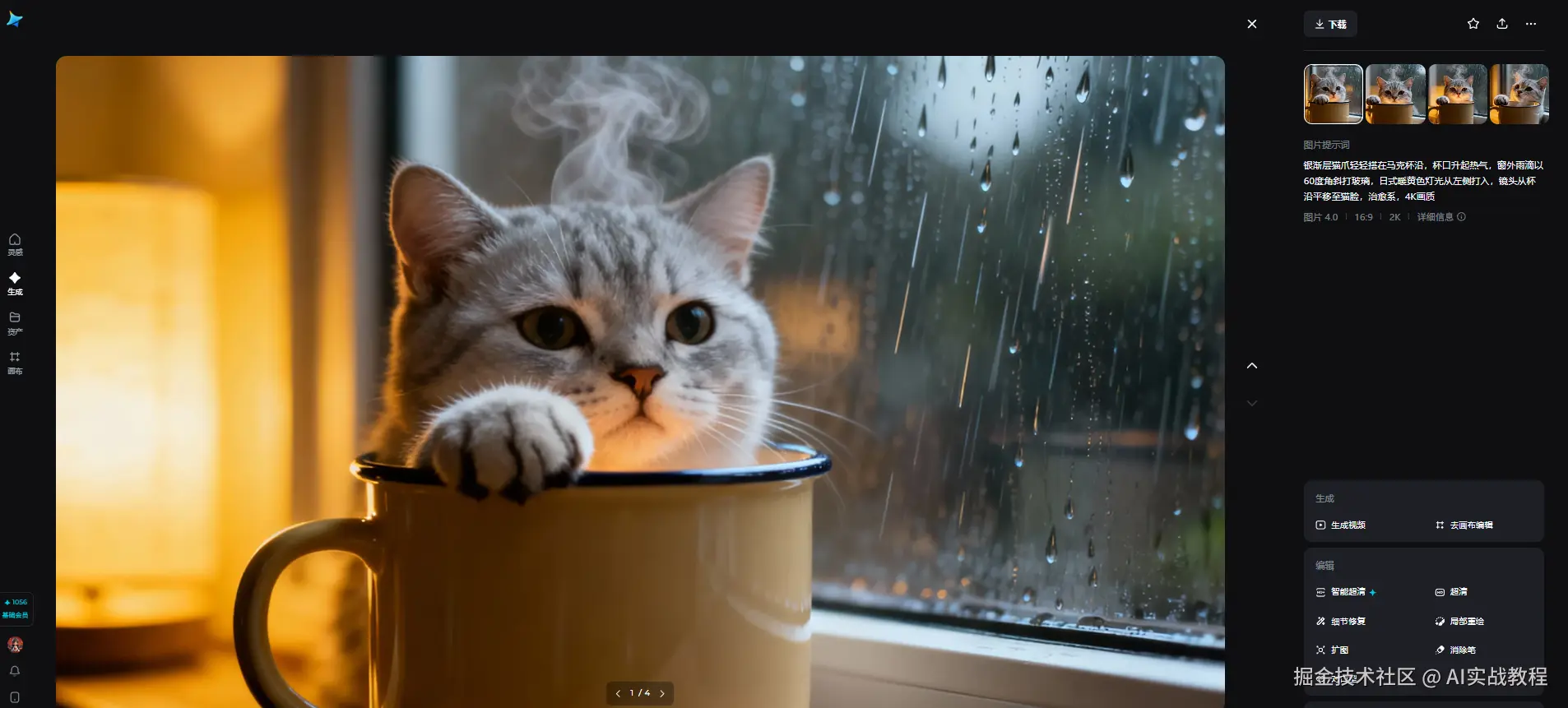 但是我们使用即梦AI,进入"文生视频"界面。输入:"银渐层猫爪轻轻搭在马克杯沿,杯口升起热气,窗外雨滴以60度角斜打玻璃,日式暖黄色灯光从左侧打入,镜头从杯沿平移至猫脸,治愈系,4K画质",这时候就耐心等待几秒,图片生成成功。