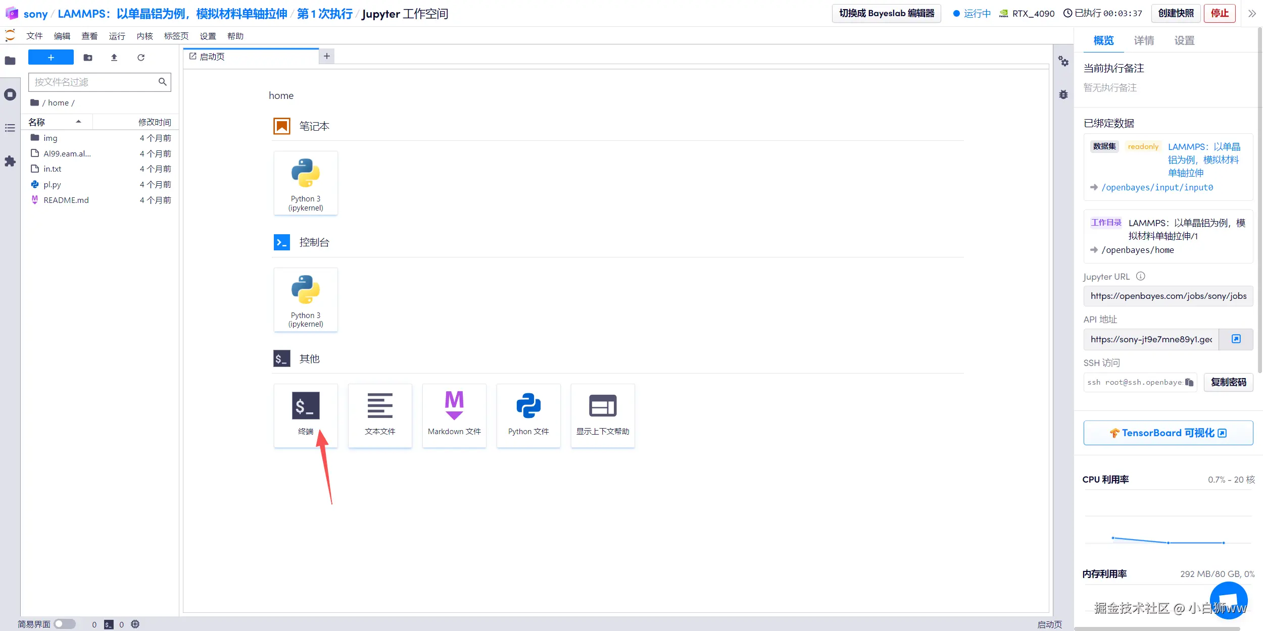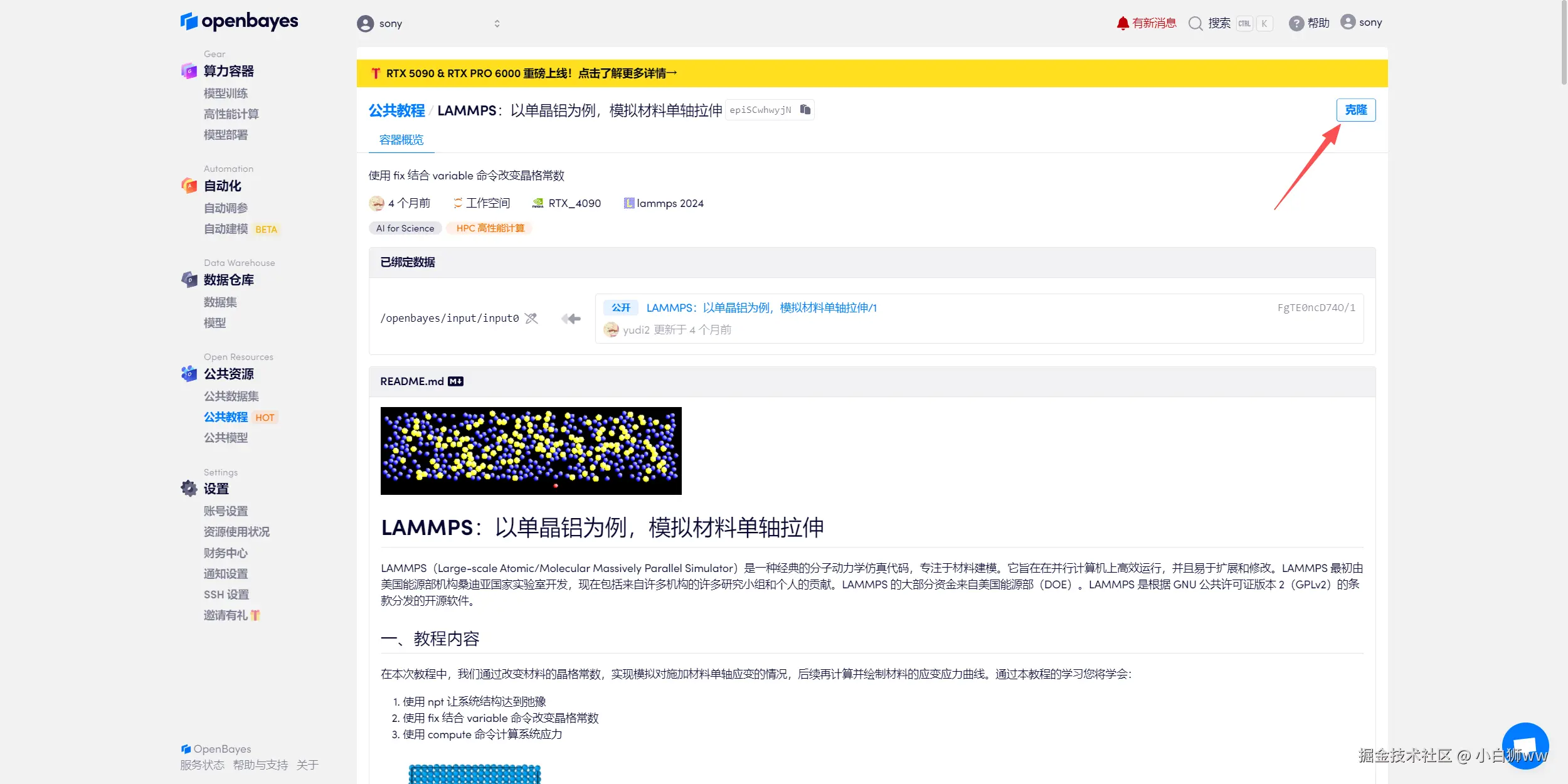 登录 OpenBayes.com ,在「公共教程」页面,选择「LAMMPS:以单晶铝为例,模拟材料单轴拉伸」教程。