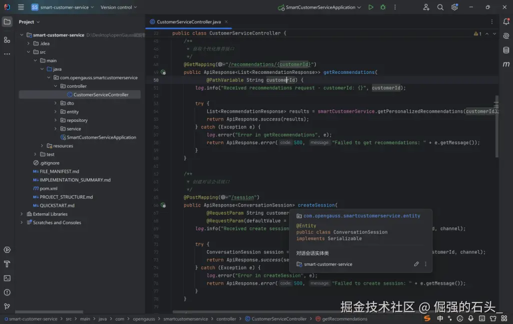 实现类: SmartCustomerService.createConversationSession(), logMessage(), closeConversationSession()
