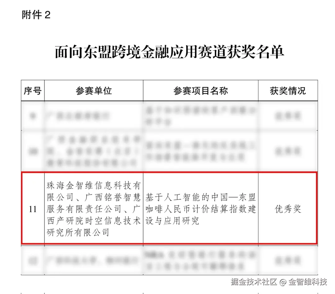 由金智维牵头提交的《基于人工智能的中国——东盟咖啡人民币计价结算指数建设与应用研究》 ,凭借其在跨境金融服务领域卓越的创新性、显著的经济效益和广阔的应用前景,在众多项目中脱颖而出,荣获“面向东盟跨境金融应用赛道”优秀奖。