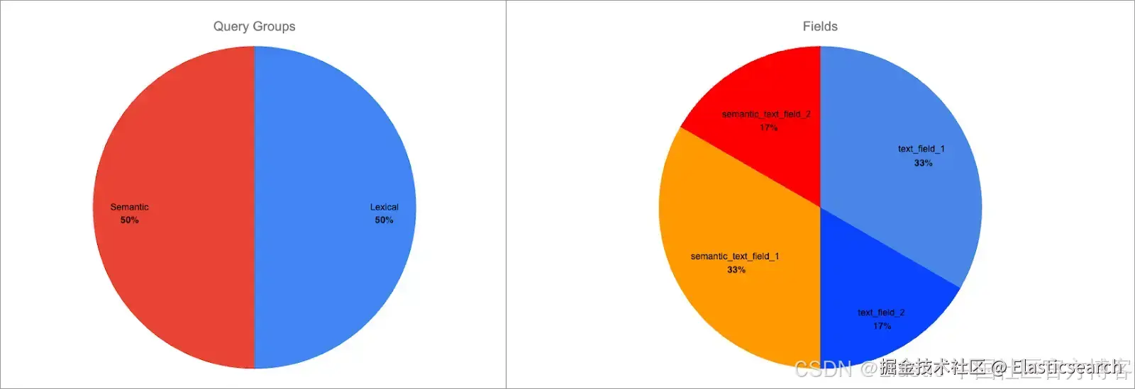 这可能不是你想要的,因为它会造成分数不平衡。在像这个只有 3 个字段的示例中,影响可能不太明显,但当查询更多字段时就会成为问题。例如,大多数索引包含的词汇字段远多于语义字段(即 dense_vector、sparse_vector 或 semantic_text)。如果我们用上面的模式查询一个有 9 个词汇字段和 1 个语义字段的索引呢?词汇匹配将占总分的 90%,削弱语义搜索的效果。