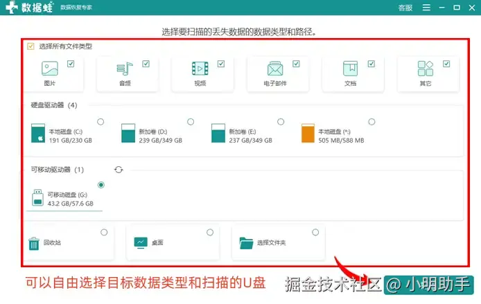 数据 蛙恢复专家支持新用户免费使用扫描功能,作为一款U盘数据恢复软件免费版,我们可以根据自己实际遇上的文件丢失情况进行扫描设置,选择丢失文件类型,选择目标U盘,精准缩小扫描范围,能够助力软件扫描的效率会变得更高哦。