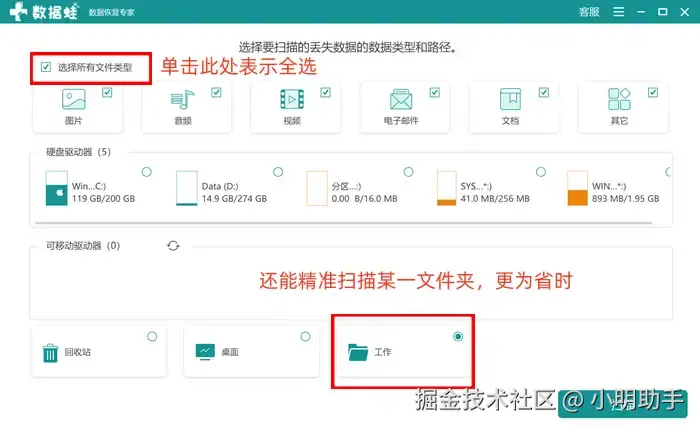 简洁清新的页面: 这款软件给予用户极高的自由操作度,我们可以通过该“扫描设置页”完成数据类型和扫描位置的设置(可以选择扫描电脑内部硬盘,也可以选择扫描电脑外部存储设备)。