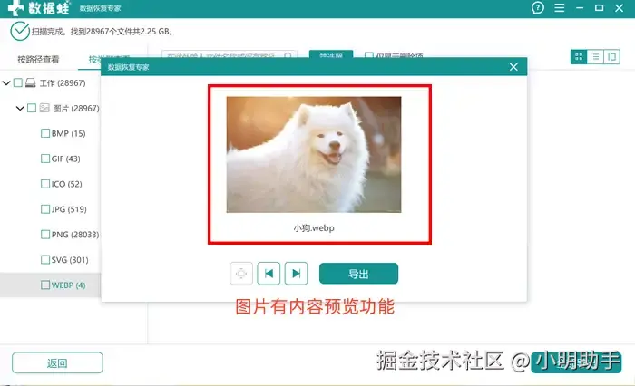 文件预览能力: 通过该软件扫描出来的文件,我们可以查看其基本信息(文件原名、创建和最后修改时间、大小、类型),如果扫描出来图片文件,还有预览大图可以查看。