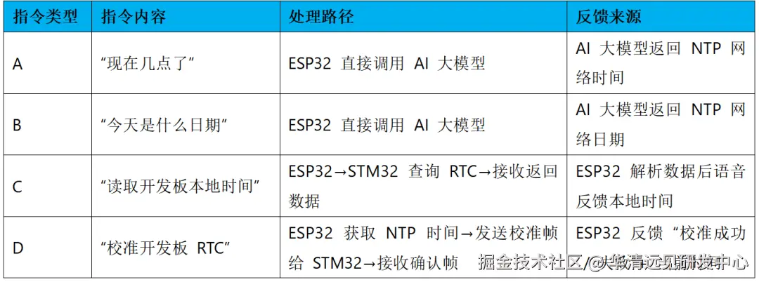 本项目实现了基于语音交互的智能时间校准系统。系统采用双芯分工架构:ESP32-S3负责语音交互和WiFi连接,STM32负责控制外部RTC芯片(PCF85063A)读写时间。系统支持两类指令路径:A/B指令(如"现在几点了")由ESP32直接调用AI大模型返回NTP网络时间;C/D指令(如"读取开发板本地时间"、"校准开发板RTC")需双芯交互,ESP32获取网络时间后与STM32的RTC时间比对,如果有误差将校准时间。整个系统实现了从语音唤醒到时间查询/校准再到语音反馈的完整闭环功能。