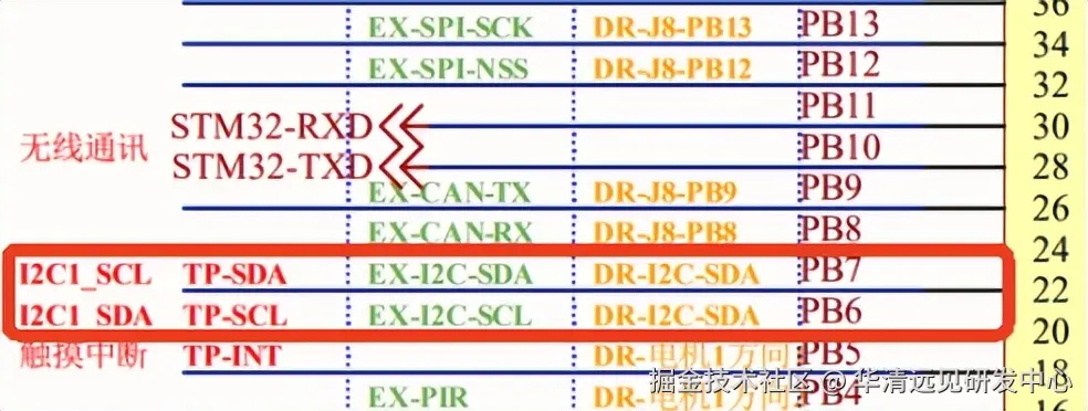 上图可以看出连接传感器的I2C引脚为PB7和PB6,引脚定义如下表: