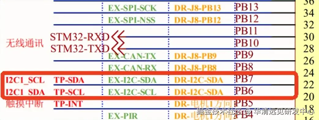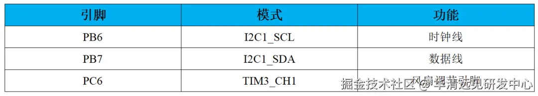 上图可以看出连接传感器的I2C引脚为PB7和PB6,引脚定义如下表: