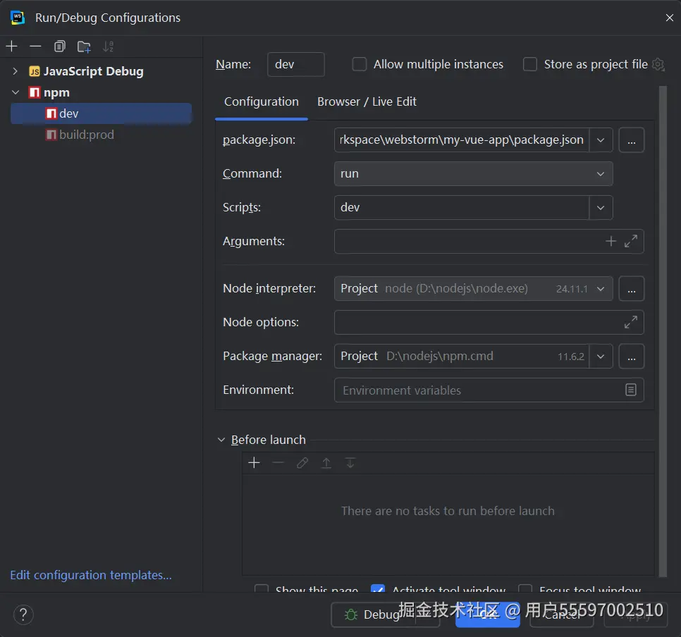 - 如果不想使用命令行启动,还可以直接在IDE配置npm启动命令,后续直接debug启动。