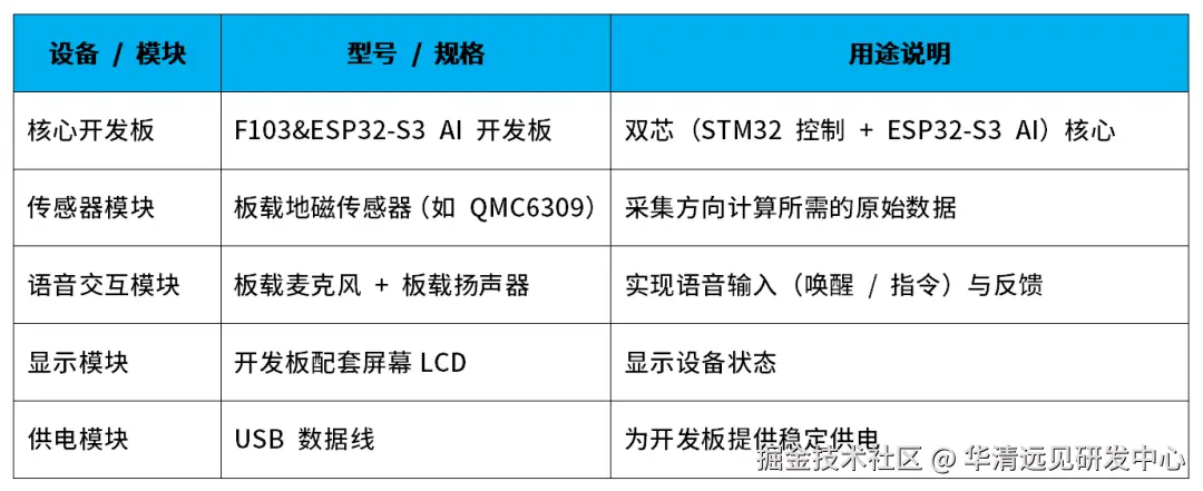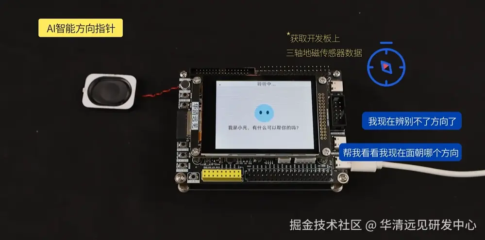 主硬件平台: 华清远见F103&ESP32-S3 AI开发板(板载三轴地磁传感器、麦克风、扬声器)+2.8寸显示屏。