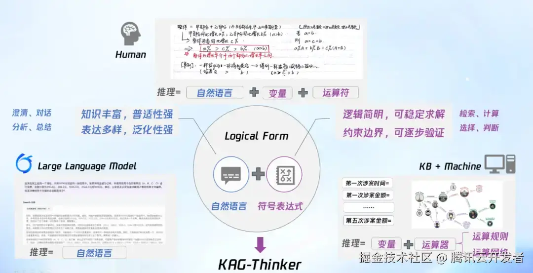 具体来说,KAG-Thinker 其实是以逻辑形式(Logical Form)为中心,将三类推理模式进行统一,一是纯自然语言推理,二是自然语言结合变量与运算符的推理,三是仅基于变量与运算符的形式化推理。通过这种统一表达,KAG-Thinker 能够将外部依赖(如外部检索、调用外部求解器等)转化为内化推理过程,从而有效提升推理的可控性与可解释性。