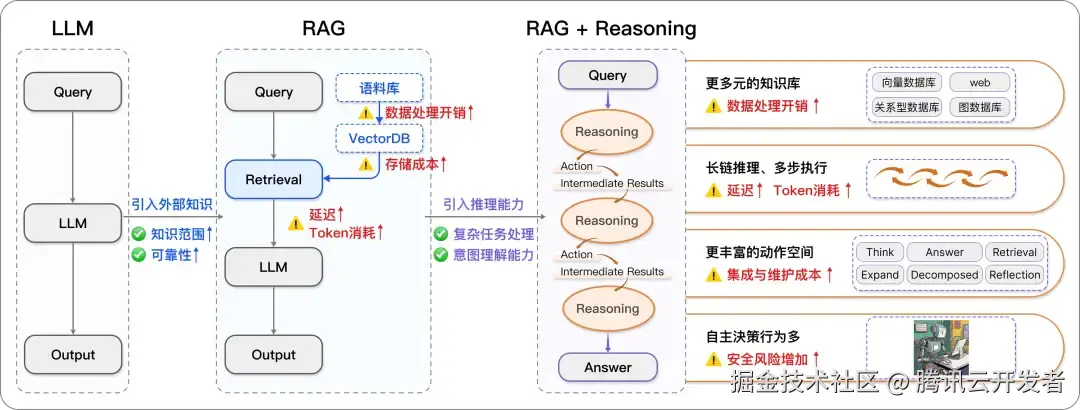在前述讨论中,我们提到大模型通过引入外部检索和求解器调用来扩展其能力,但这种依赖在实际应用中也面临一系列挑战。随着从大模型到 RAG 的过渡,虽然引入了外部知识库,系统的存储开销、token 消耗以及授权成本等方面却显著增加。此外,尽管推理增强能够处理更复杂的任务,但整体流程耗时增加,这对实际落地应用提出了新的挑战。