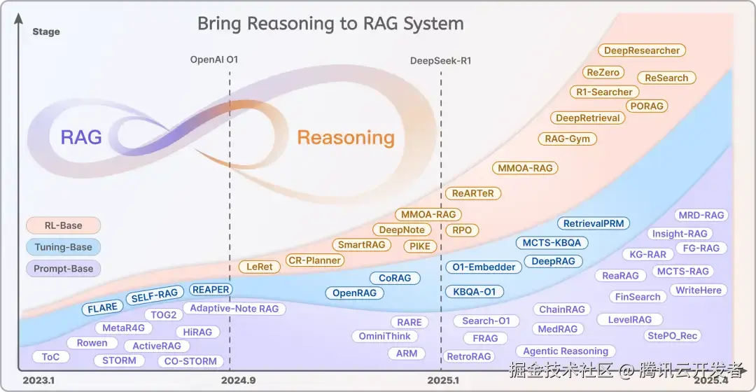 随着 OpenAI o1 和 DeepSeek-R1 等慢思考模型的兴起,RAG 与推理能力结合的研究逐渐增多,促进了 RAG 技术在垂直领域的落地和发展。在这一过程中,技术创新不仅涵盖了最轻量级的提示工程(Prompt Engineering)和微调方法(Fine Tuning),更重要的是基于强化学习(Reinforcement Learning,RL)的方法,特别是在 DeepSeek-R1 发布之后,这类方法变得愈加普及和广泛应用(例如上图橙色区域)。
