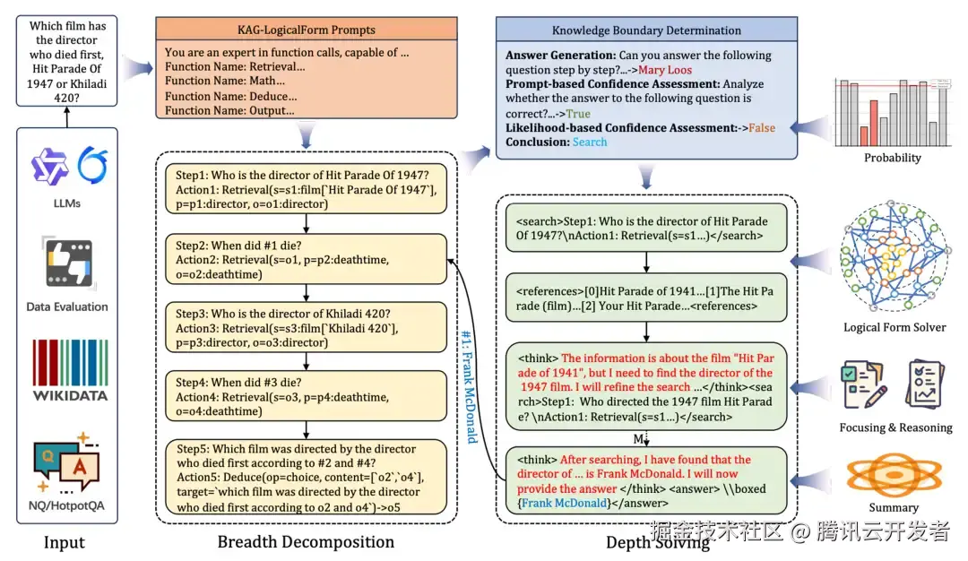 KAG 技术的核心之一是如何通过逻辑符号引导的结构化推理来实现复杂问题的求解。 为此,我们需要将原始问题按需分解为多个子问题,并清晰地刻画这些子问题之间的逻辑依赖关系。在此基础上,系统应能自主判断以下几项决策: