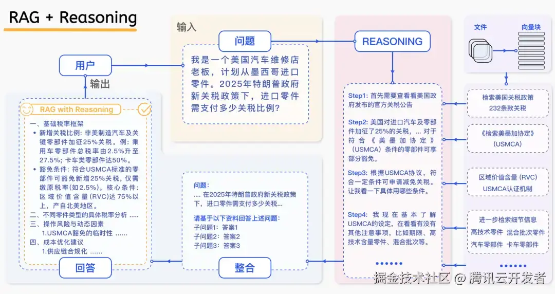 RAG 与推理的融合,本质上是一个动态任务规划与执行的过程。它将复杂问题系统性地拆解为多个子任务,如理解、分解、检索、验证与整合,从而形成一条逻辑自洽的推理链。在上图关税案例中,传统 RAG 模型可能会直接拼接多个信息片段,生成一个笼统的回答。而 RAG + Reasoning 模型则会采取更为精细的步骤:首先理解问题结构,然后分解子问题,进行多轮检索与交叉验证,最终综合推理并生成建议。这种方法使得结果不仅仅是信息的简单堆砌,而是一份结构清晰、逻辑严密、并具备实用价值的专业建议。