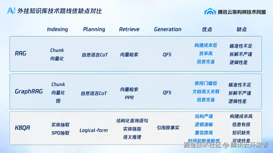 导语 | 随着人工智能技术的迅速发展,基于大语言模型(LLMs)的应用逐渐成为主流。然而,这些大模型在实际应用中仍像在“闭卷考试”,一旦题目超纲便只能凭空编造,即便后来引入 RAG 让其“开卷”,也常因翻不到正确的页码而答非所问。尤其在垂直领域的应用中,单纯依靠大模型往往无法满足复杂业务对精准问答、实时知识更新和推理深度的需求。因此,技术正从 RAG (Retrieval Augmented Generation, 检索增强生成) 走向 KAG (Knowledge Augmented Generation,知识增强生成框架) :通过整合知识库与结构化推理,让“开卷”不仅翻得到页,还能按逻辑划重点。本文特邀同济大学特聘研究员、博导、腾讯云 TVP 王昊奋重点探讨从 RAG 到 KAG 的技术演进过程,并分析 KAG 框架如何有效解决传统 RAG 模型的不足,为垂直领域应用提供更加精准和高效的解决方案。