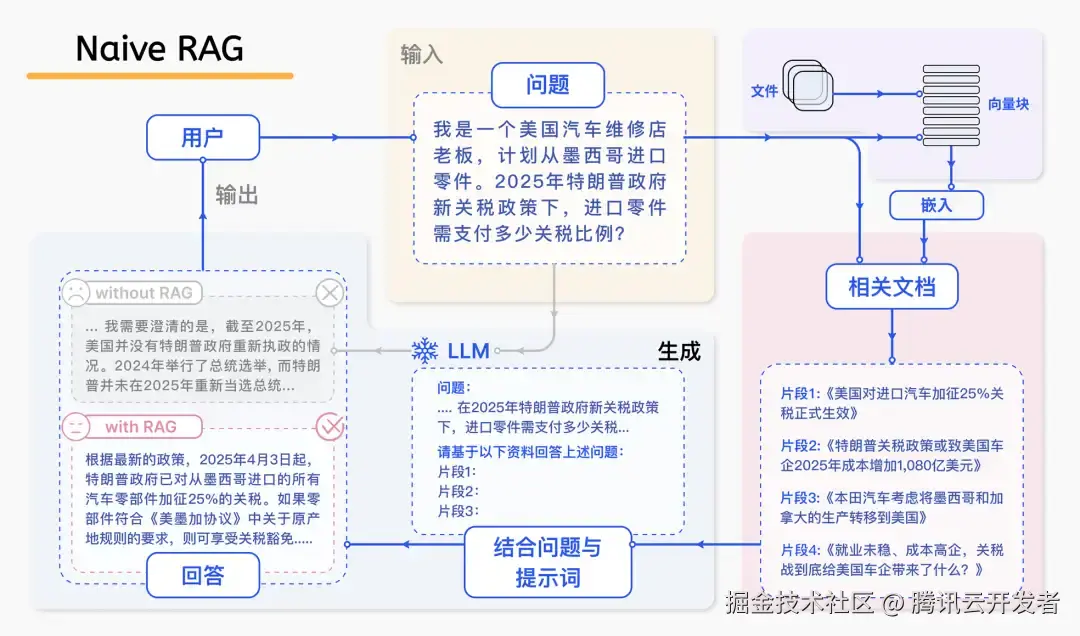 为应对这些挑战,目前的技术探索趋向于通过外挂知识库(如 RAG)来弥补大模型本身的不足。尽管 RAG 技术已从最初的基础 RAG 发展到具备自主决策能力的 Agentic RAG,但在实际应用中仍然面临挑战。即便引入了 RAG,当大模型遇到预训练数据未覆盖的最新或特定领域问题时(例如政策法规中的“关税”细节,见下图),其表现依旧可能无法令人满意。