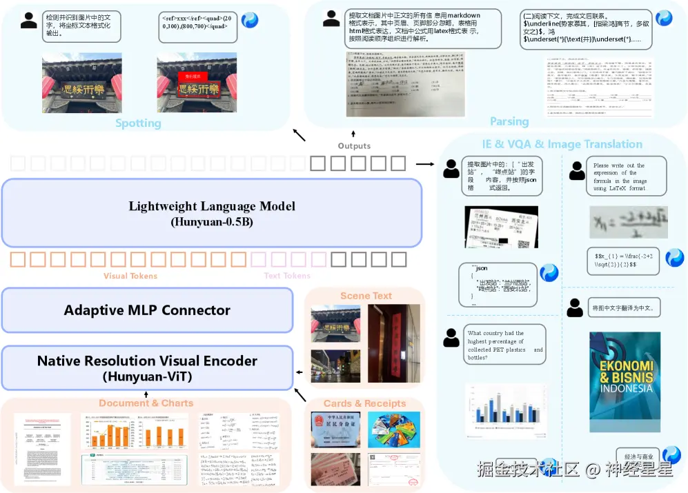 本文提出 HunyuanOCR,一个面向 OCR 任务的商用级、开源且轻量级(10 亿参数)视觉-语言模型(VLM)。该模型架构由原生视觉 Transformer(ViT)与轻量级大语言模型(LLM)通过 MLP 适配器连接而成。HunyuanOCR 展现出卓越的性能,超越了现有商业 API、传统处理流程以及参数量更大的模型(如 Qwen3-VL-4B)。