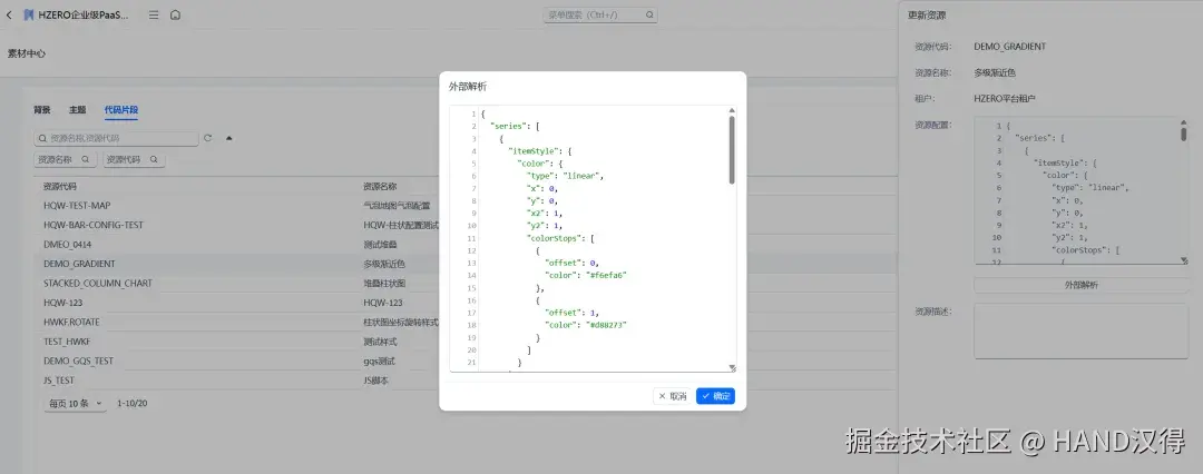 比如:仪表板组件支持 JSON 格式的代码片段配置,如下图所示
