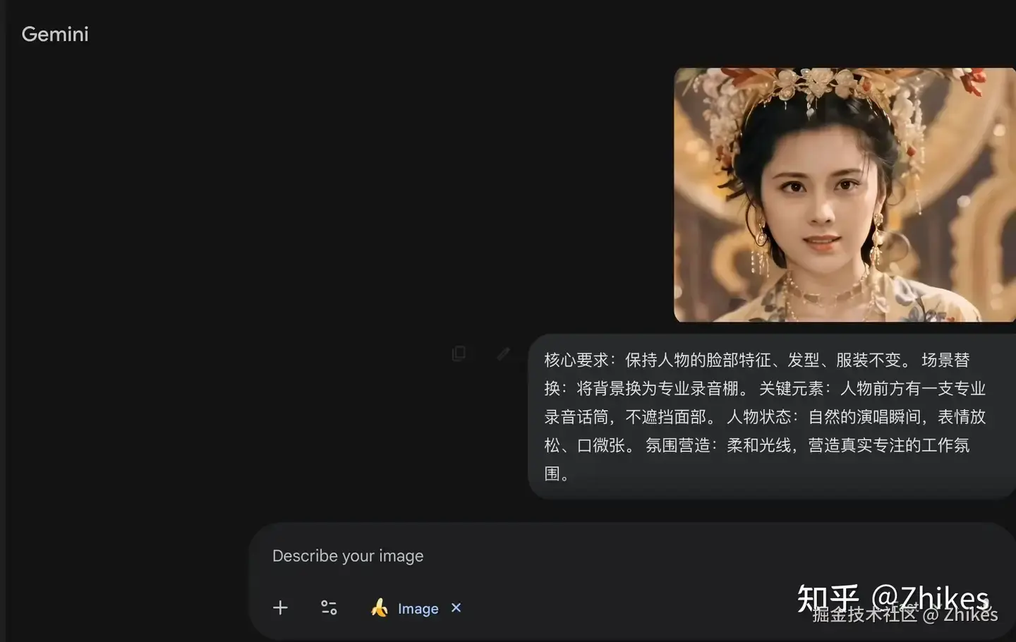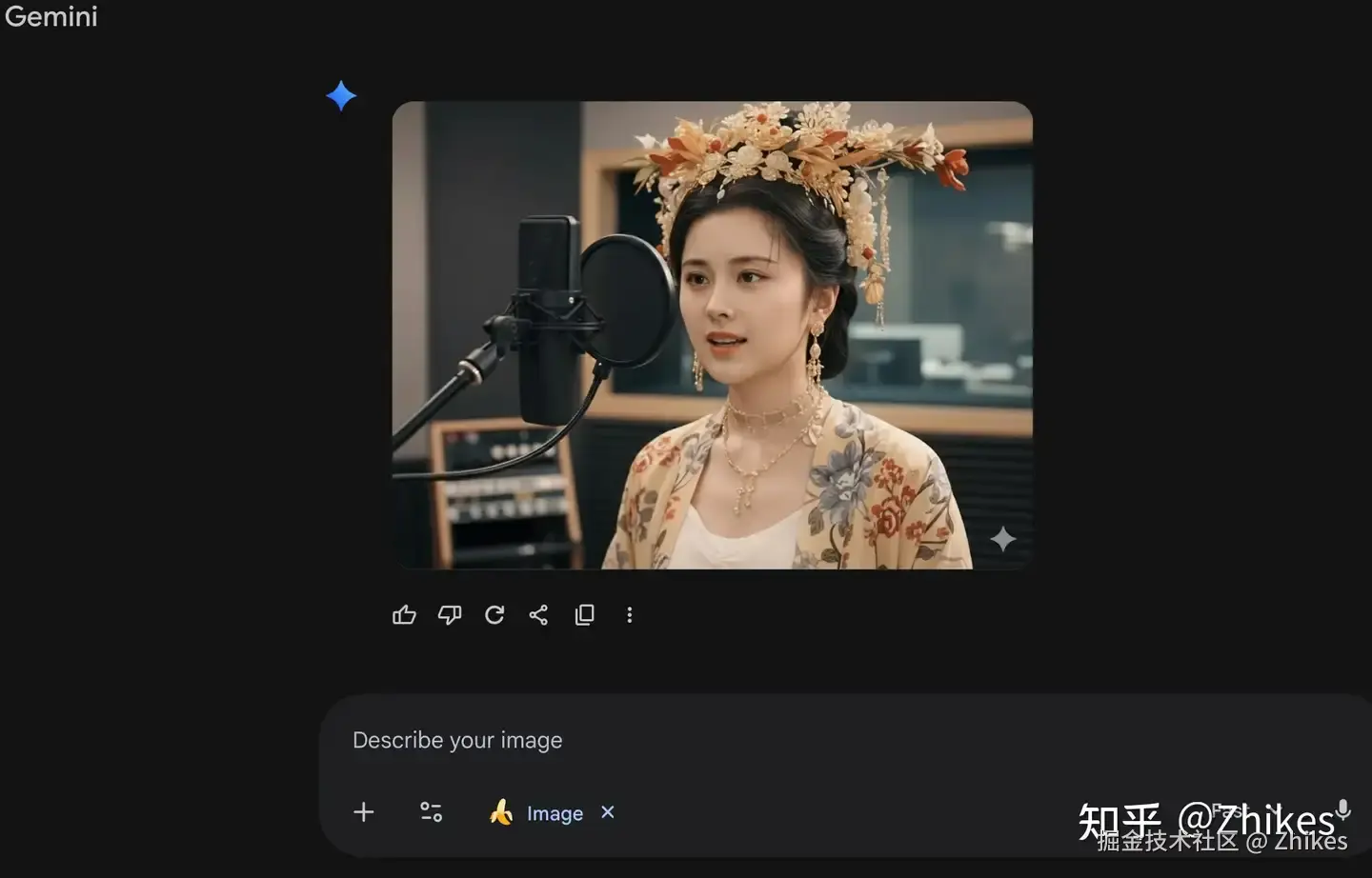 先用 AIGC 工具生成一张人物在麦克风前的照片,常用工具包括 Nano Banana(Gemini)、豆包、千问等。这里以 Nano Banana 为例gemini.google.com/app,推荐以下提示词: