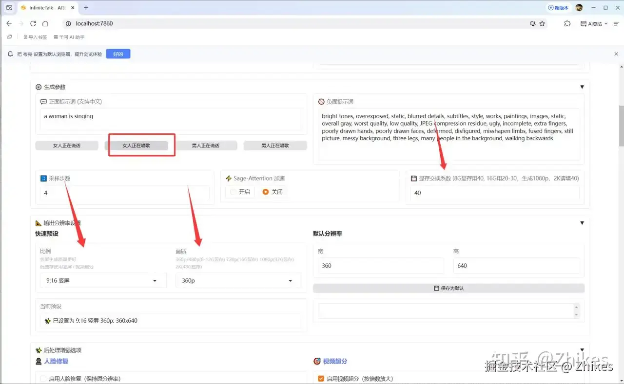提示词选择女人在唱歌就行,显存交换系数按照提示填,比例和画质按照你的需求以及显卡显存选择即可。