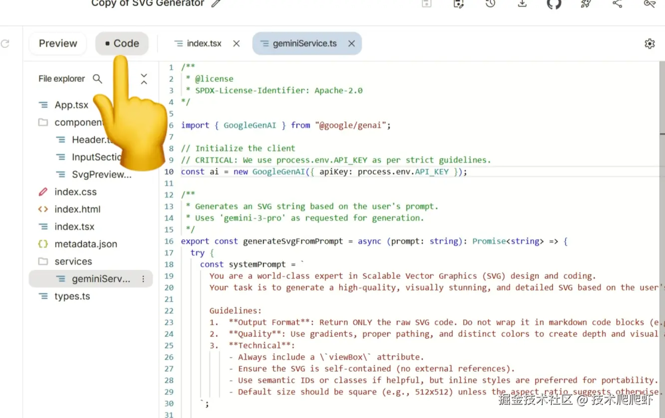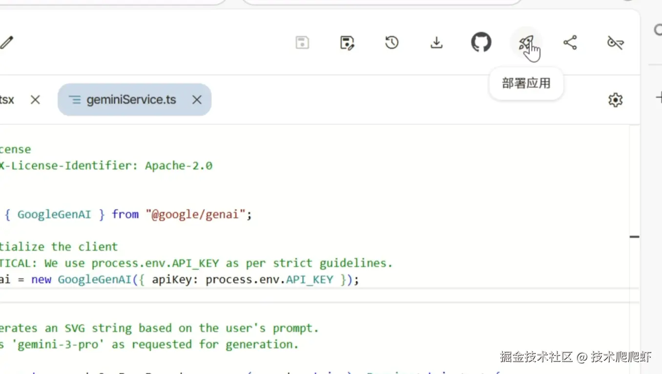 接下来,我们看如何部署有AI功能的应用。这里我还是从官网的样例库,在最下面有一个SVG生成器。这里我们输入一句话,点击“generate”,gemini会调用它的AI功能,为我们生成一个SVG的图片。这样图片就生成好了。