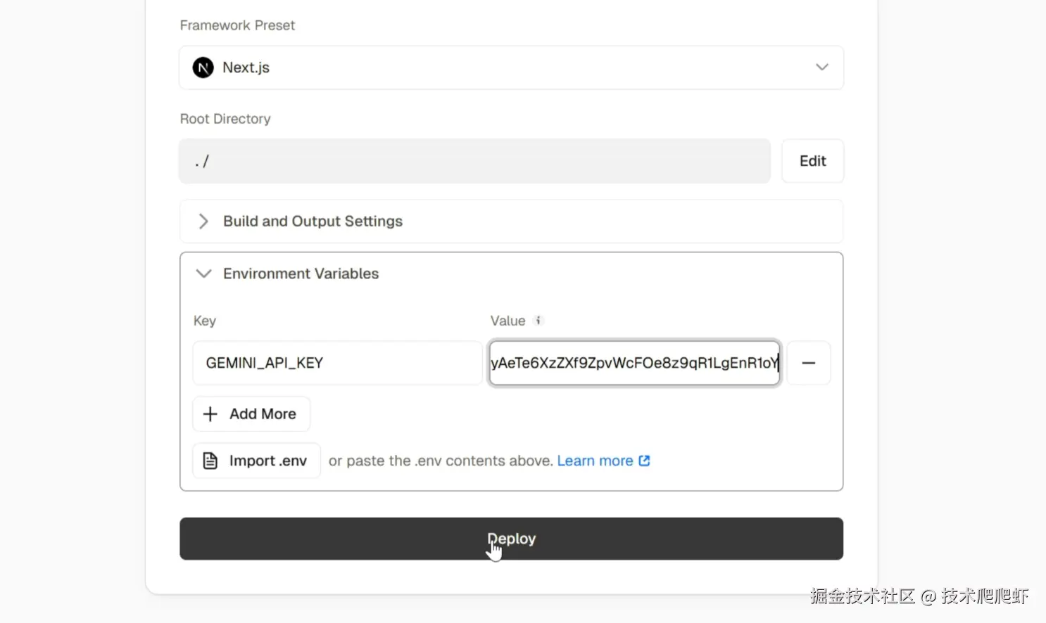 。然后我们还是用Vercel部署一下,“add new--> project”,选到我们的项目,点击“import”。我们看到Vercel已经智能的识别出了目前的框架是Next.js,所以这些配置都不用改。我们只需要在Environments里面把环境变量填写上 GEMINI_API_KEY,值的话,这里要填写一个真实的API Key。