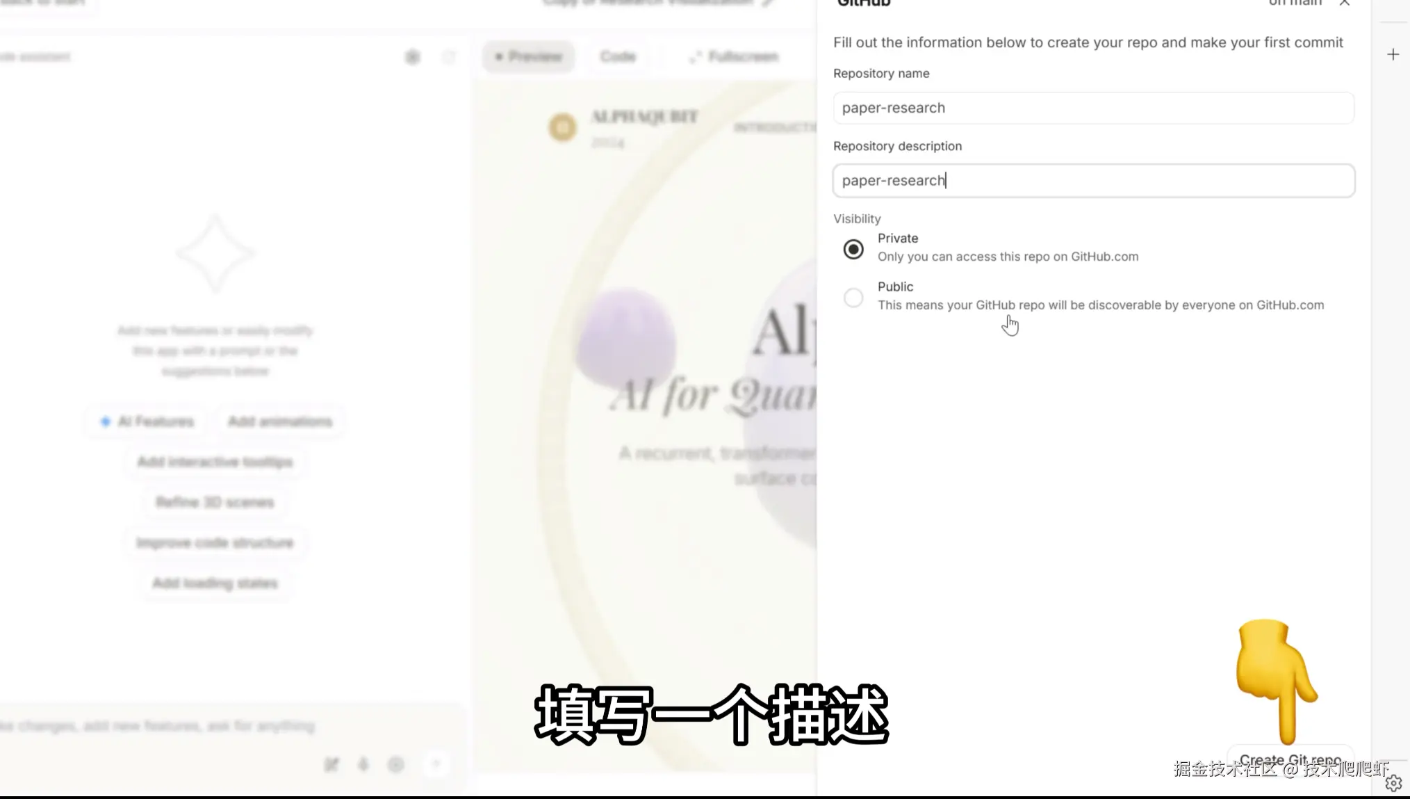 这里,需要先把应用克隆一份到自己的名字底下,点击“保存”。如果没登录过GitHub账号的话,会提示我们先登录一下。然后给仓库起一个名字,填写一个描述,右下角点击“create git repo”,再点击右下角的“stage and commit”。