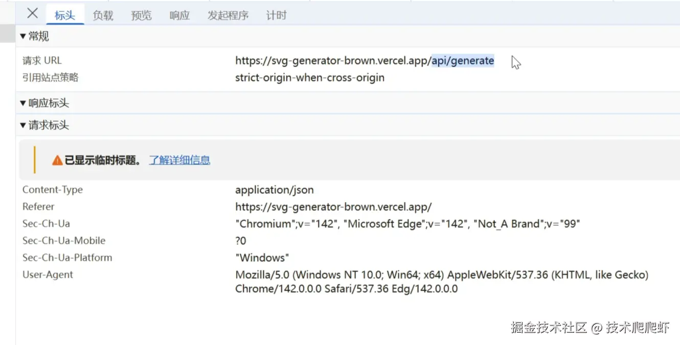 好,部署成功了。我们再来试一下,我让他画一个椒盐爬爬虾。我们在浏览器的网络请求可以看到,他调用后台的时候走的是api/generate接口,并且这个请求里他是不携带 API Key的。