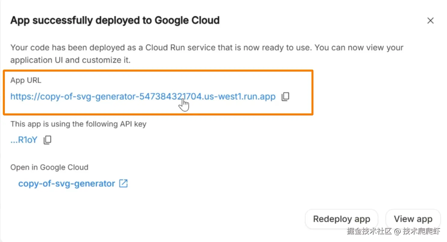 然后点击部署。部署完成以后,它自动生成了一个Gemini的 API Key供项目调用,还生成了一个应用链接。