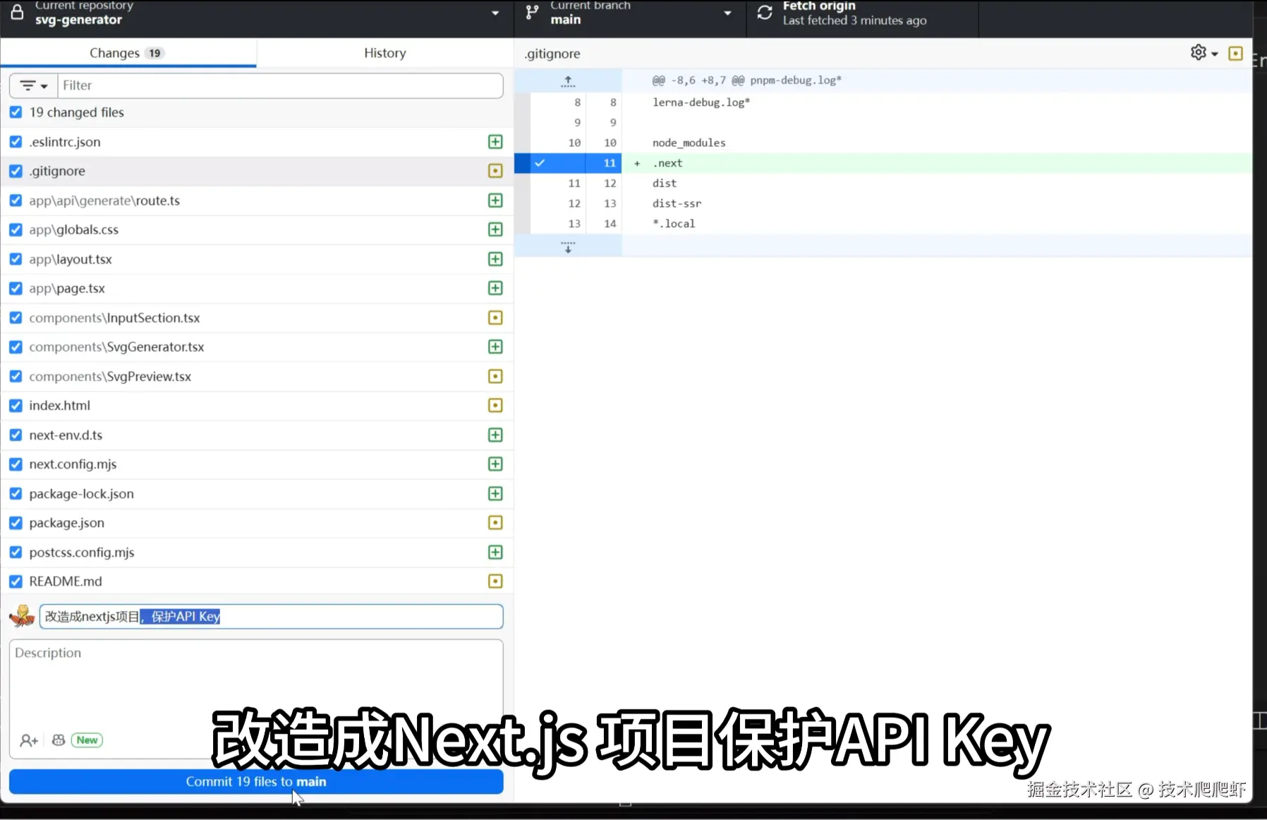 接下来我们把它部署一下。我们回到GitHub Desktop,在这里填一个commit message,我的message是:“改造成Next.js 项目,保护API Key”。然后提交,点击“push origin”,把文件都推送到GitHub上面