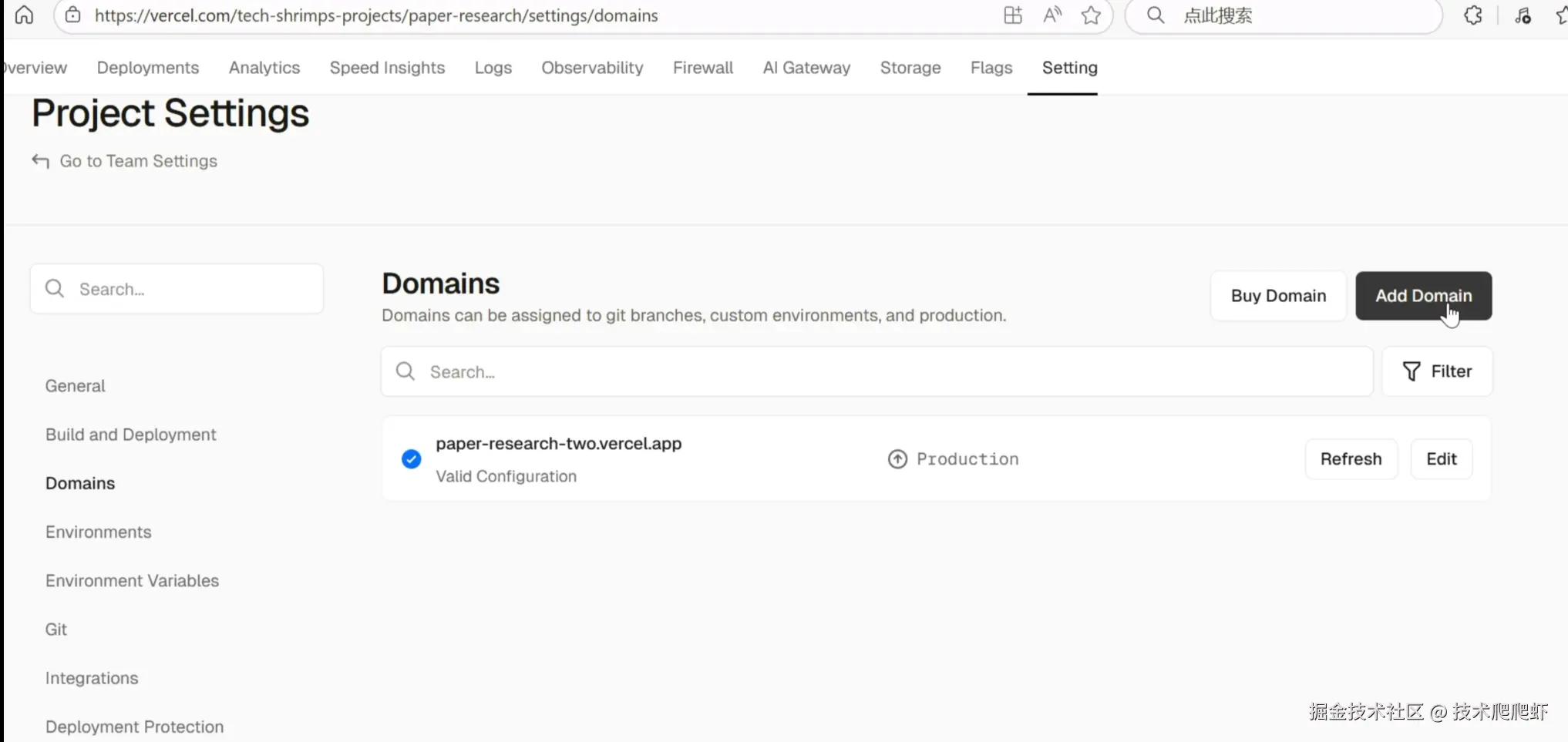 然后来到settings,左边有一个domain,点击这个“add domain”,可以绑定一个自己的域名,用自己的域名在国内就可以访问到了。有的观众朋友们可能没有自己的域名,那也有别的办法。