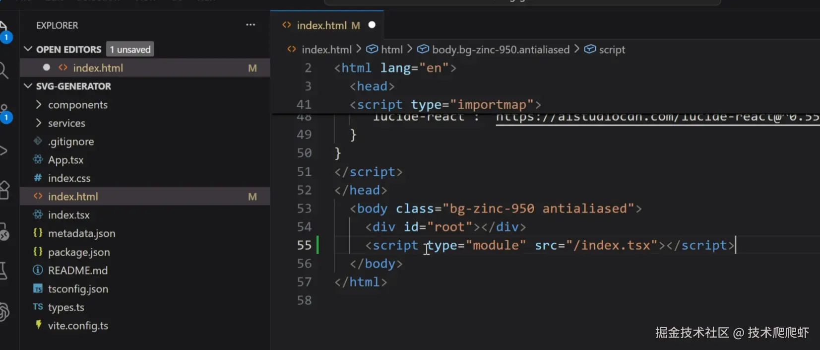 然后我使用VS Code打开文件夹,选择刚才我们克隆下来的文件夹。进来以后第一件事,找到index.html,先把缺失的那行代码给它添加上。