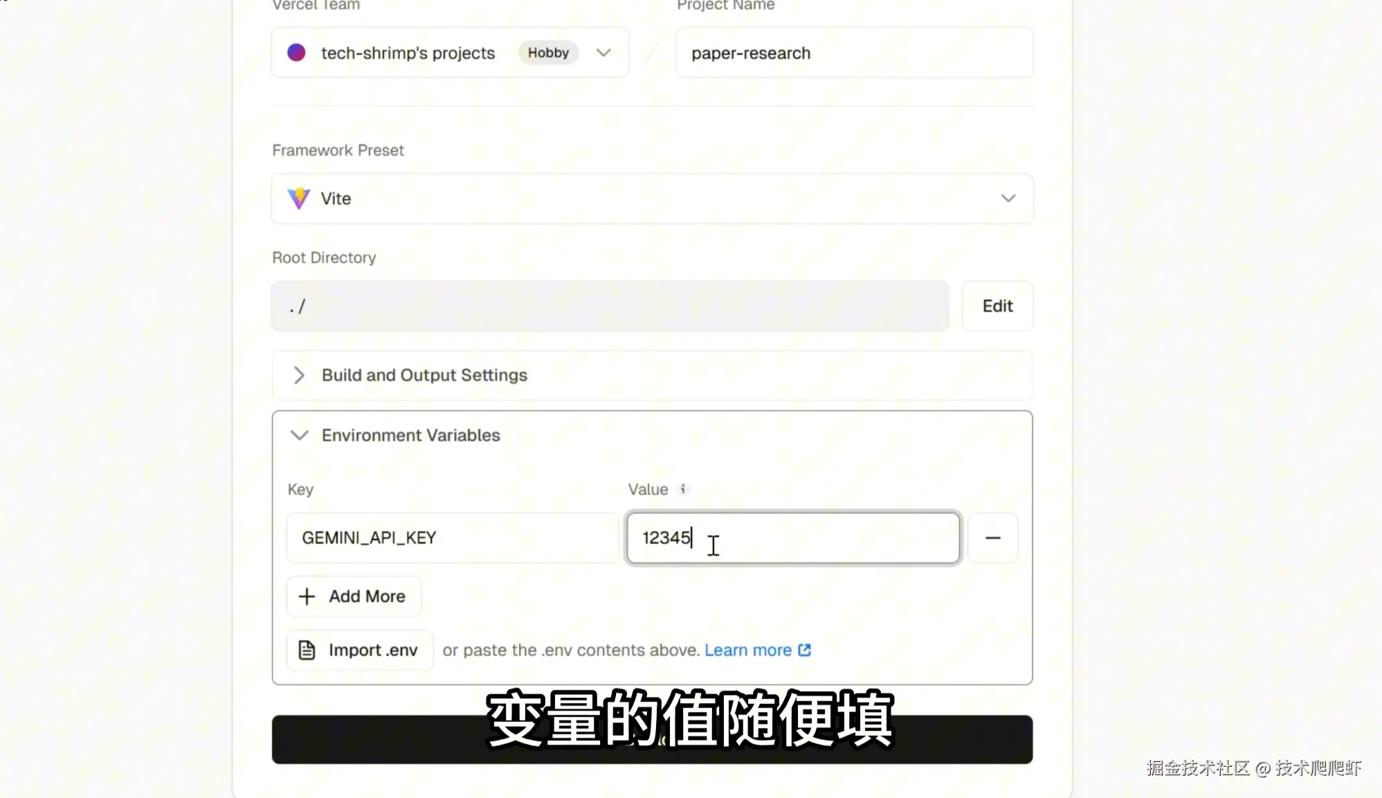 进来以后,右上角点击“add new -->project”。Vercel会自动的识别项目框架,所以这些配置都不需要改。我们展开下面的Environment,填写一个环境变量,变量的名字叫做Gemini API Key,变量的值随便填一个假的占位就可以了。