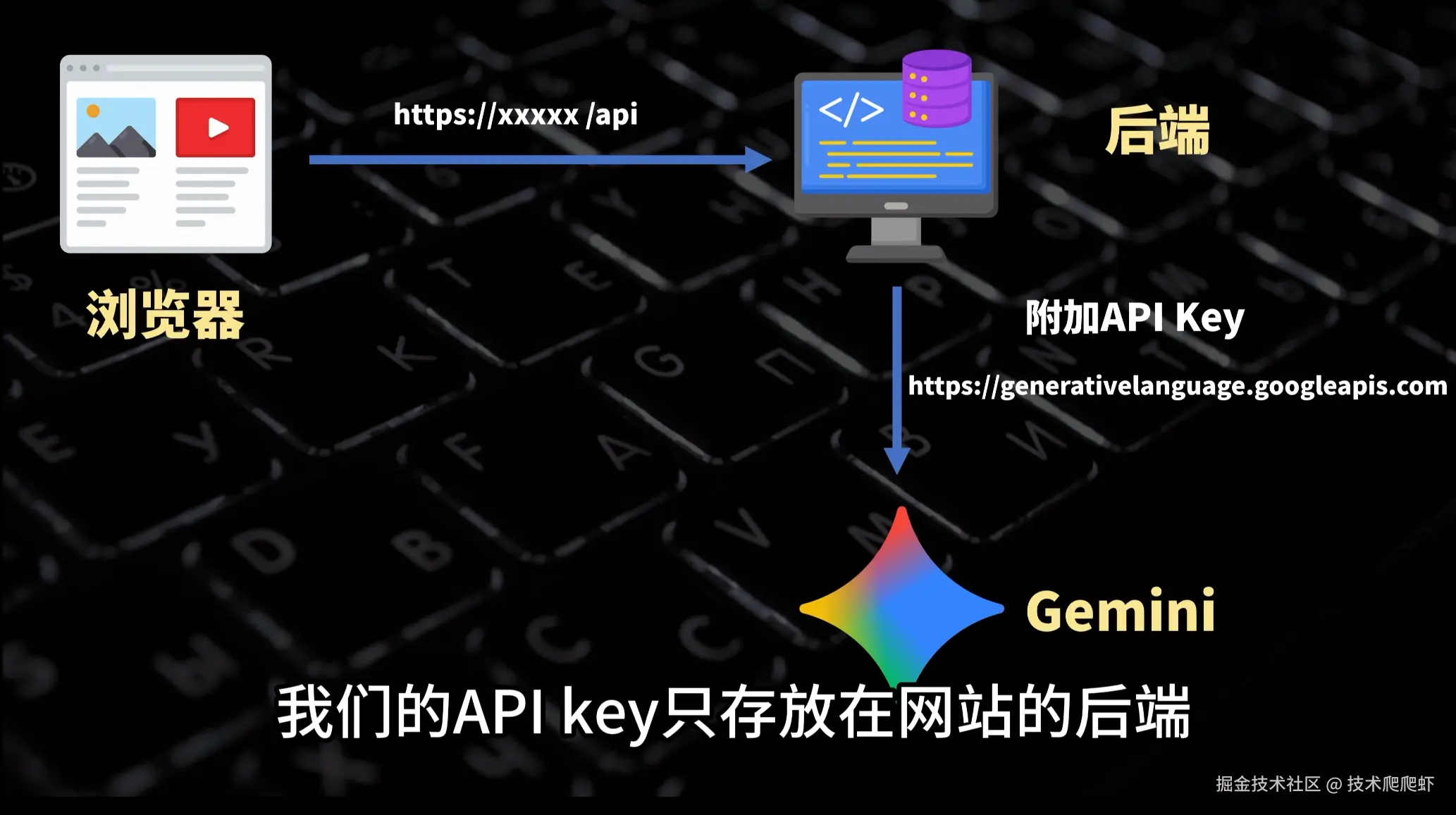 我们还有另外一个方案,就是把项目改造一下,改造成一个前端加后端的完整应用,从后端调用Gemini的API。我们的API key只存放在网站的后端,这样也可以保护API key。