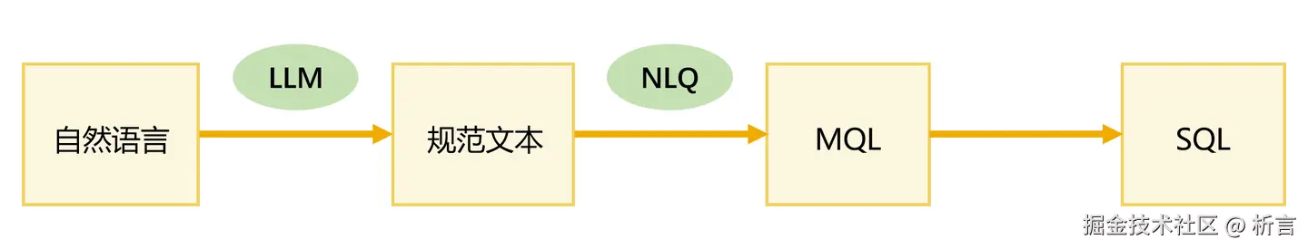 这里增加了一个规范文本环节。从自然语言到规范文本的转换由 LLM 实现;从规范文本到 MQL 的转换由专门的 NLQ 引擎完成;从 MQL 到 SQL 的转换则就是常规的代码翻译程序了。