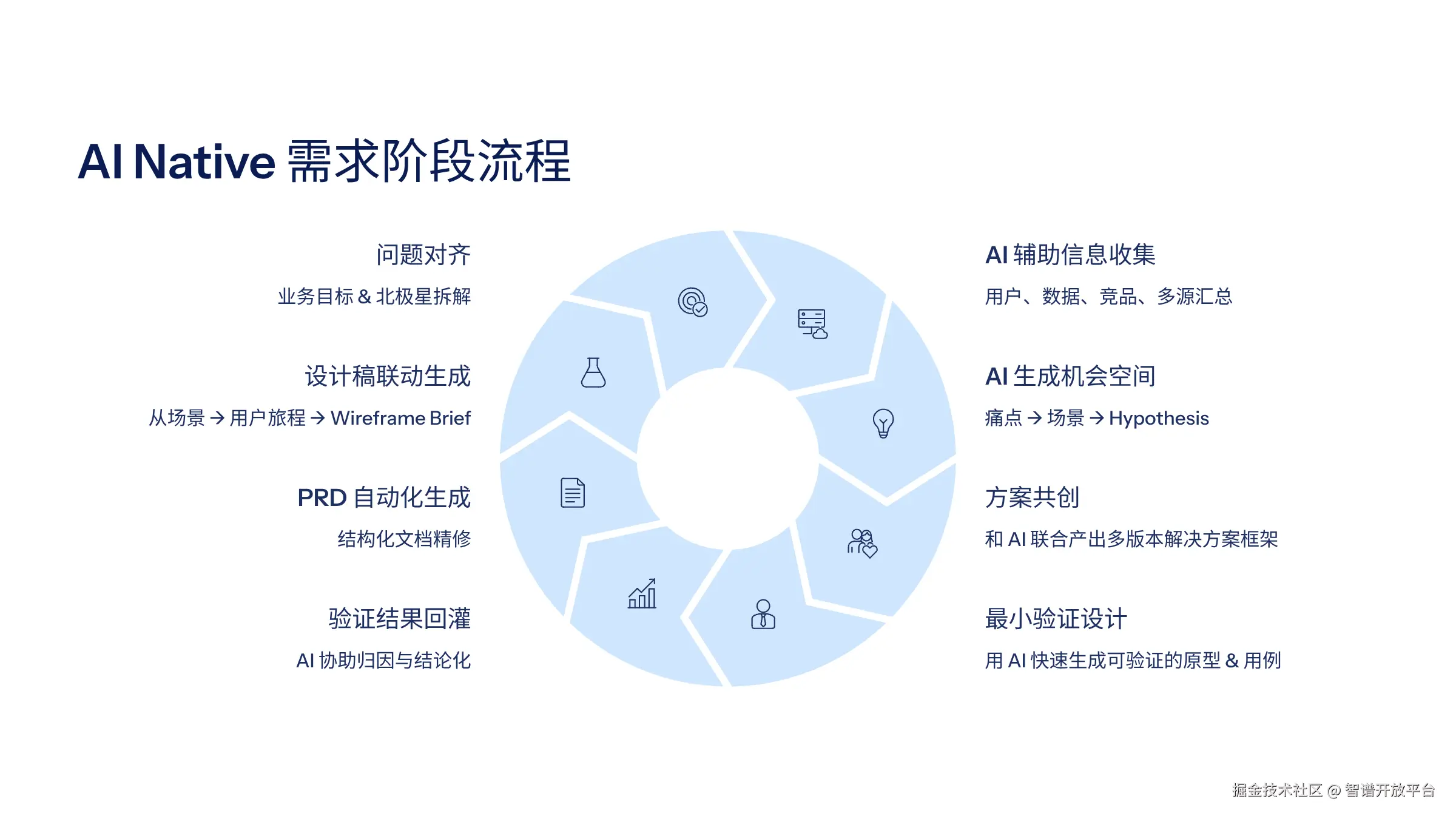 让产品经理借助 AI,把“需求发现 → 假设生成 → 快速验证 → 方案收敛 → PRD + 设计稿”变成一条高速闭环流水线,而不是线性手工车间。
