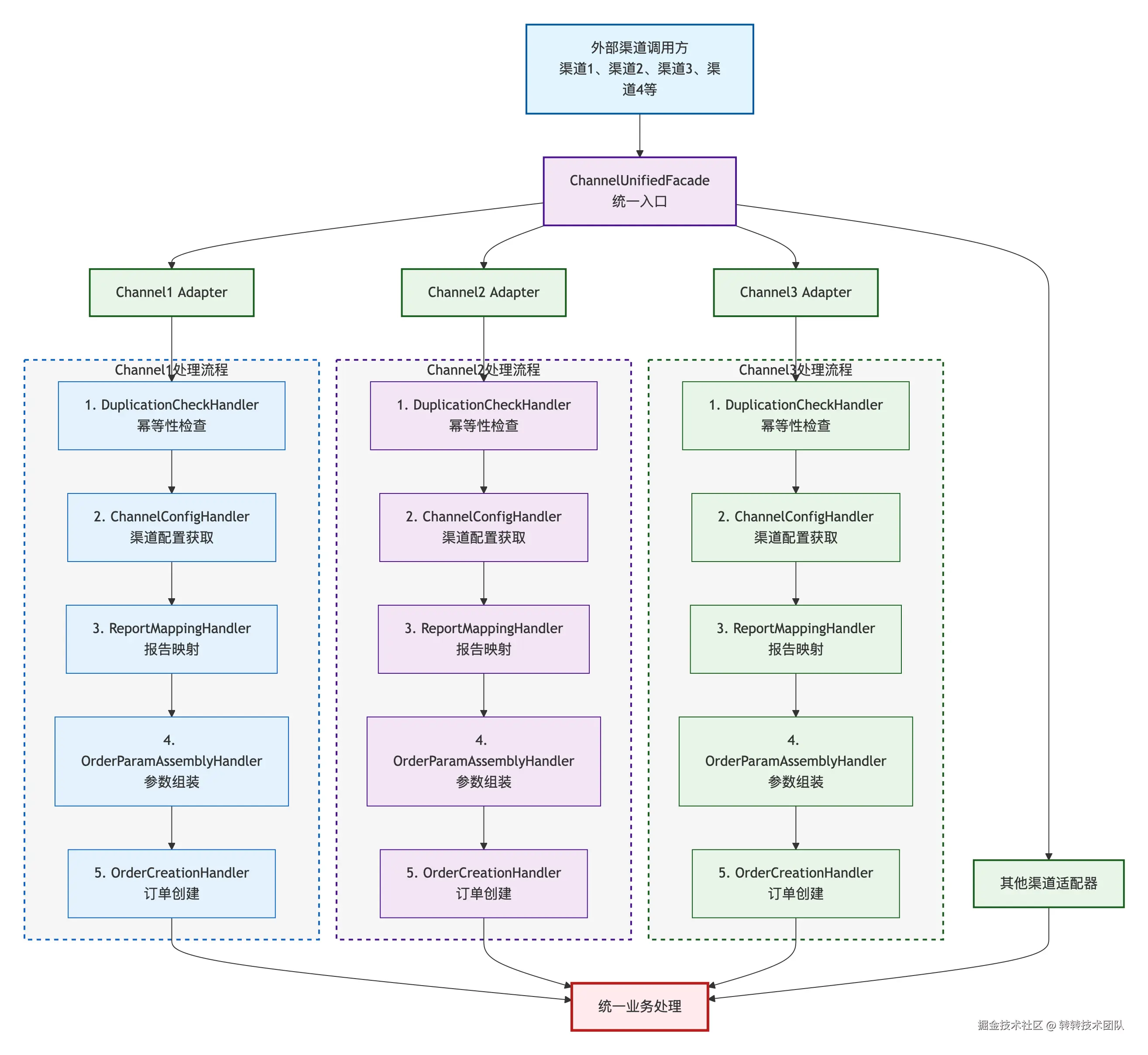 // A渠道:标准流程 chain.addHandler(duplicationCheck) .addHandler(channelConfig) .addHandler(reportMapping) .addHandler(orderParamAssembly) .addHandler(orderCreation); // KA渠道:额外增加权限校验 chain.addHandler(duplicationCheck) .addHandler(kaAuthCheck) // KA特有 .addHandler(channelConfig) .addHandler(reportMapping) .addHandler(orderParamAssembly) .addHandler(orderCreation);