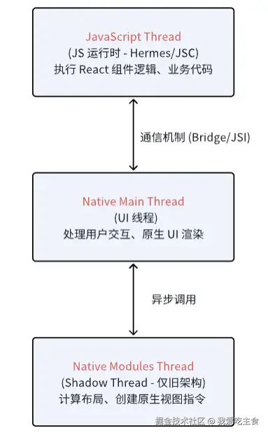 当你第一次用React Native写完一个按钮,点击后看到原生界面乖乖响应时,可能会惊叹:"JavaScript居然能指挥原生控件?"这种魔法般的体验,让无数开发者爱上RN。但当你 profiling 应用时发现莫名其妙的白屏,或列表滚动掉帧时,又会困惑:"我的JS代码到底在哪执行?它和原生UI之间隔着什么?"这些问题的答案,都藏在RN运行时的三线程通信、Bridge序列化与JSI直接调用的细节里。本文将抛开JSX与样式表,带你深入C++层,看清每一帧渲染如何跨越语言边界,以及新架构如何让"JS写原生"真正飞起来。