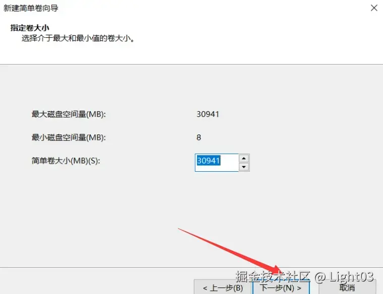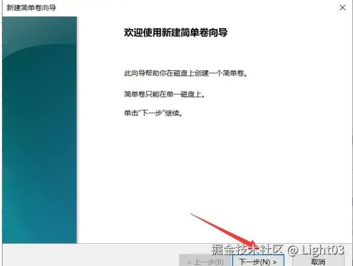 (1)弹出新建简单卷向导窗口后点击“下一步”按钮