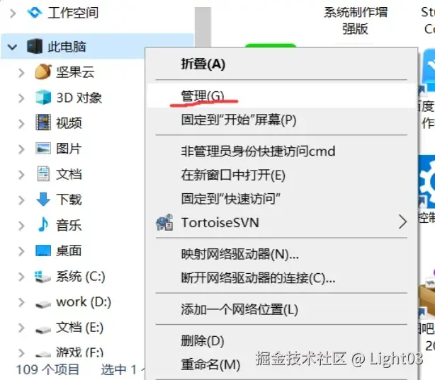在电脑图标右键选“管理”