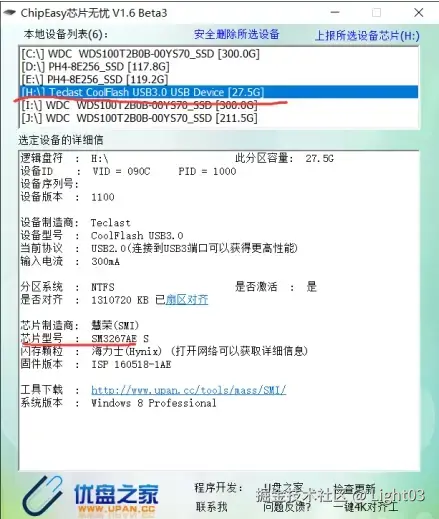 使用芯片无忧(ChipEasy)检测(国产软件,这个软件是13年的,比较旧没更新过的,也可能存在检测不到)插入u盘打开芯片无忧,如图下,上面选中U盘的盘符,便会显示U盘的信息,可以看到下图“芯片型号:xxx”就是U盘的主控型号
