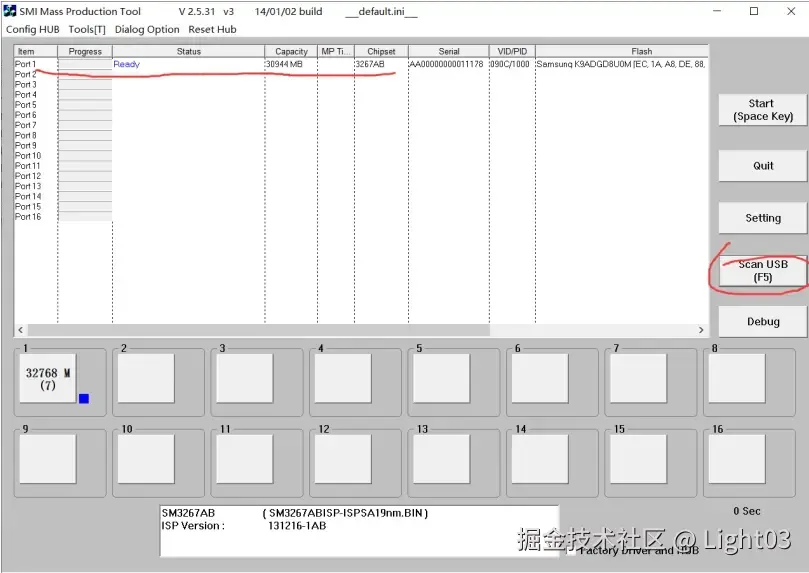 3、打开慧荣SMI量产工具,先“Scan USB(F5)”查找U盘,如果找到U盘那么界面会显示出来,如界面Port1就有数据,点击选中Port1